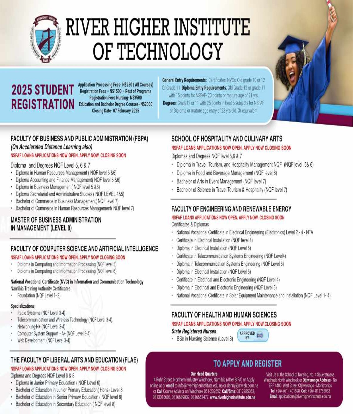 Welcome to River Higher Institute of Technology, a tertiary and vocational education college situated in Windhoek and other towns in Namibia. We have grown and improved our services and academic programs offered to all our students in Namibia. River Hihigher Institute offers you a unique opportunity that is hard to find anywhere for your future career development.